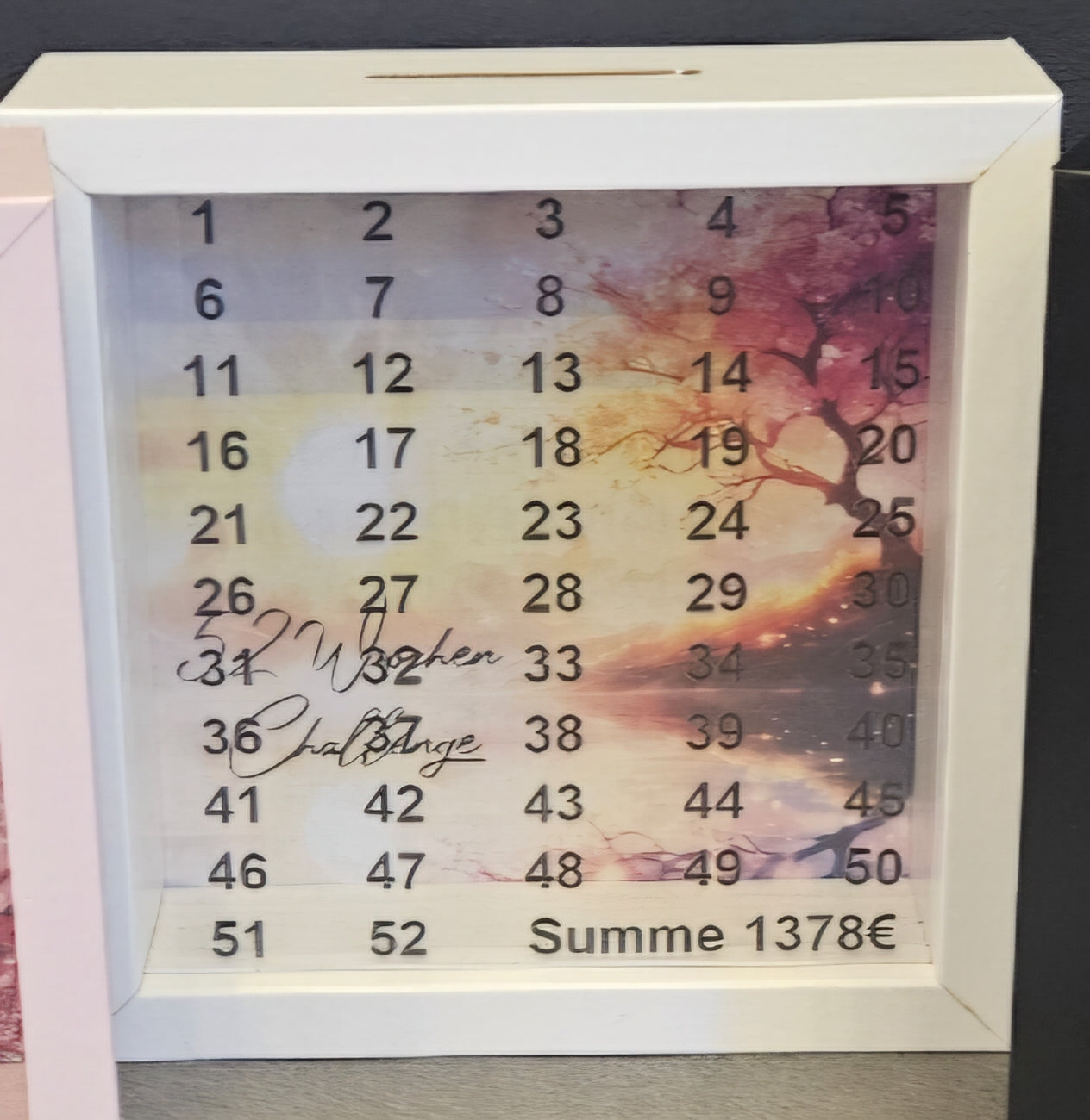 Spare 52 Wochen und streiche die Beträge vorne am Glas aus - nach erfolgreichem Sparen - hast du 1378€ gespart.
